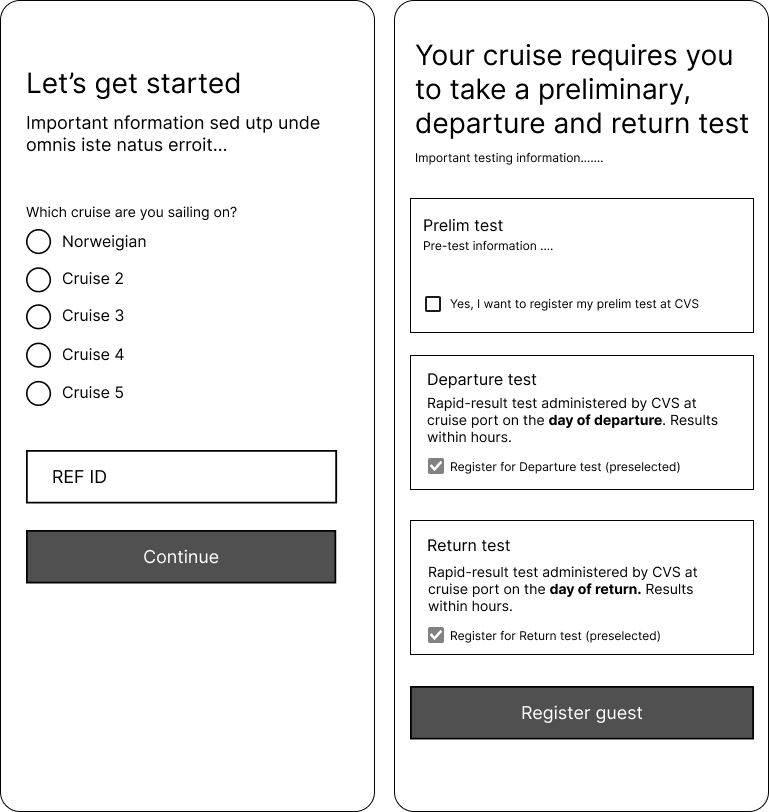 Landing page was simplified: users only needed to enter their REF ID and select their cruise.The page dynamically showed the required tests.Users could choose to take the pretest with CVS and enter their information.